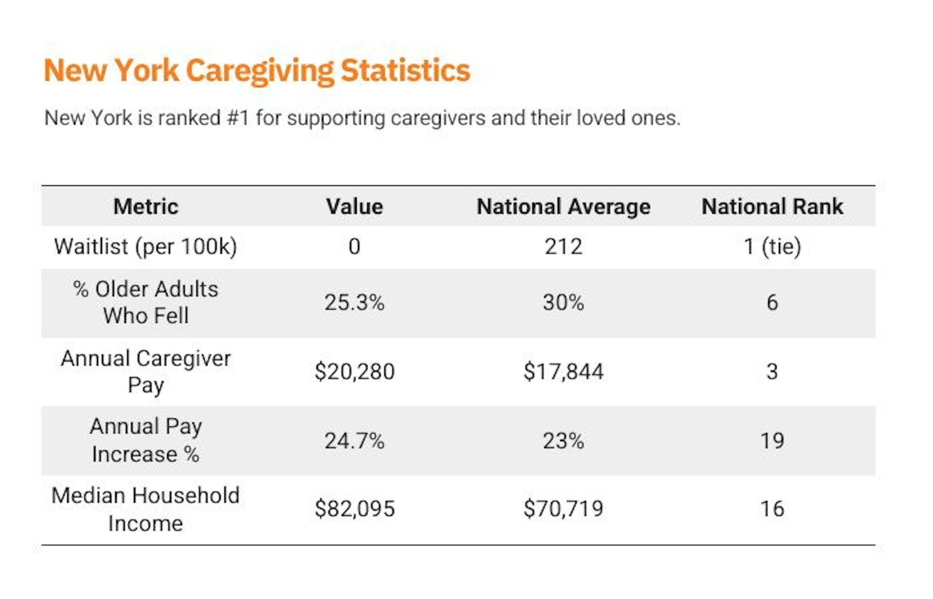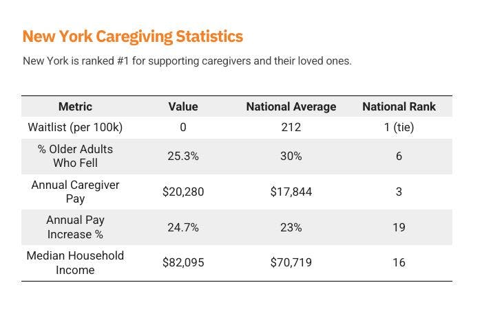New York sets a high standard for caregiving support, combining zero waitlists for HCBS services with some of the highest caregiver wages in the country. Through its Consumer Directed Personal Assistance Program (CDPAP), the state empowers families by allowing them to select and compensate caregivers of their choosing—including relatives—creating both flexibility and economic stability. With a fall rate well below the national average and caregiver pay exceeding $20,000 annually, New York's approach reduces strain on the healthcare system while keeping seniors safely at home. The state’s relatively high median income further enhances the financial viability of caregiving, positioning New York as a national leader in aging-in-place policy and family caregiver support.