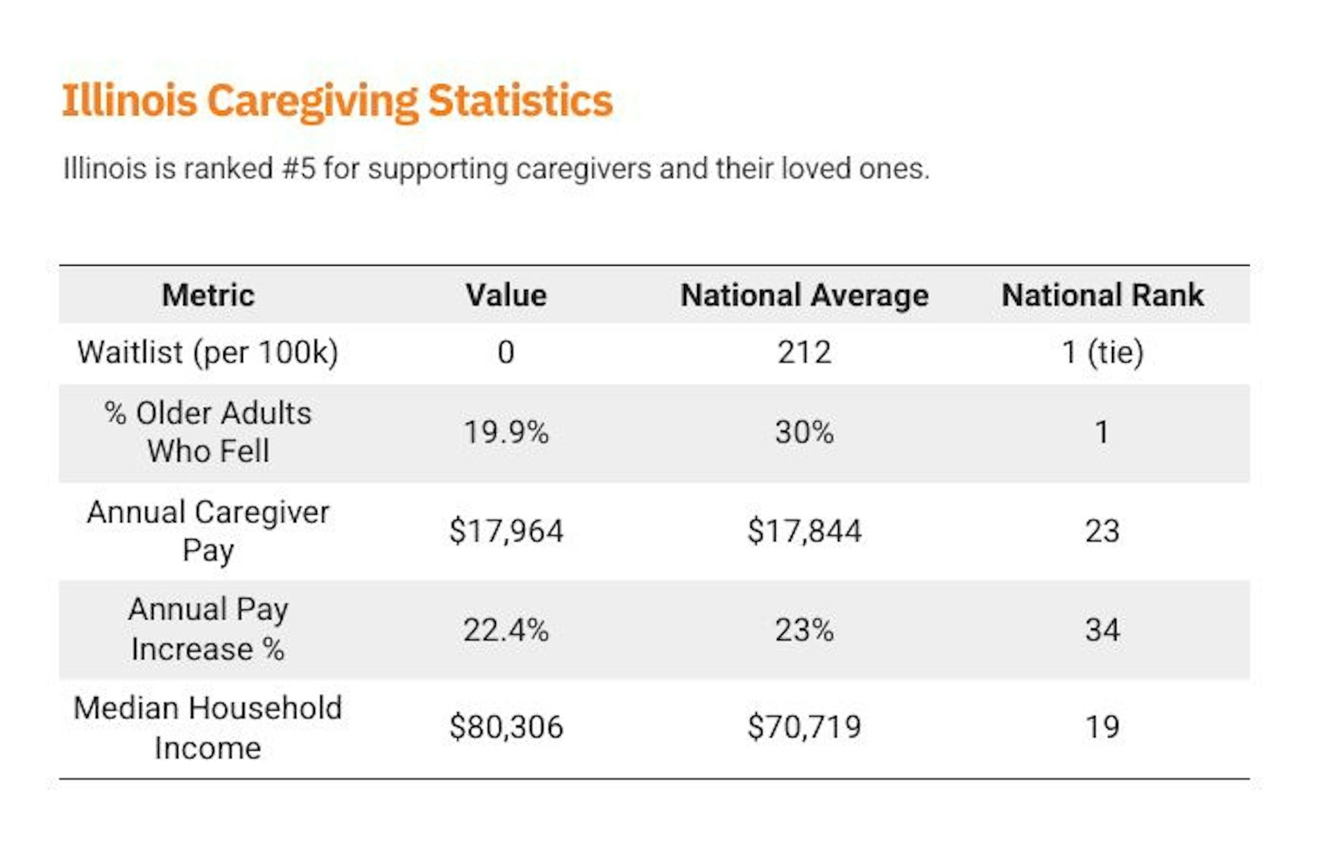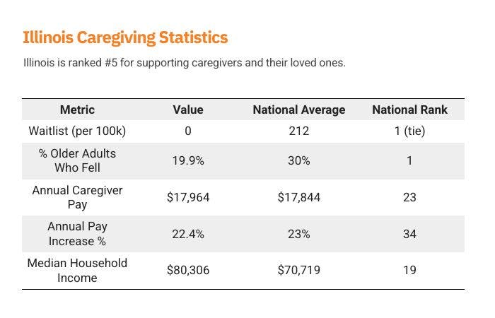 Illinois leads the nation in one of the most critical indicators of senior well-being: it has the lowest reported fall rate among older adults at just 19.9%, significantly below the national average of 30%. This achievement, combined with zero HCBS waitlists, reflects a strong infrastructure for in-home support and preventive care. While caregiver pay in Illinois is close to the national average, and wage growth is slightly below average, the state’s emphasis on accessible services appears to be paying off in health outcomes. With a median household income above the U.S. average, Illinois strikes a meaningful balance—ensuring timely access to care and reducing health risks for aging residents. Its performance demonstrates that even modest caregiver wages can go further when coupled with effective, coordinated care delivery.