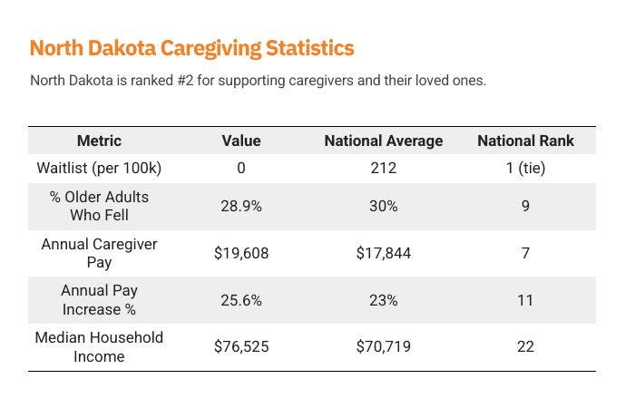 North Dakota ranks among the most caregiver-friendly states, with zero individuals on its HCBS waitlist and above-average pay for caregivers. The state's Family Paid Caregiver Pilot Program stands out as a proactive model, allowing family members to be compensated for care—an especially valuable policy in North Dakota's rural communities, where access to professional home care services can be limited. With caregiver wages nearly 10% higher than the national average and a strong annual wage growth rate, North Dakota not only values caregiving work but helps make it financially viable. While the state's median household income is slightly below the national average, the supportive infrastructure for in-home care makes a meaningful impact on both seniors and those who care for them.