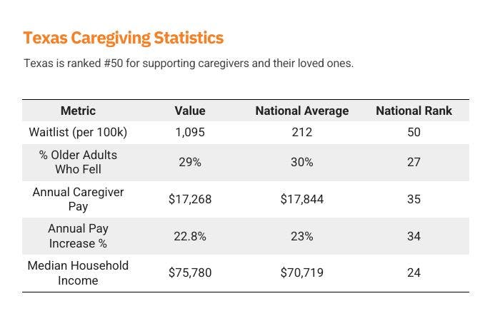 Texas tops the list of longest waitlists with more than 1,000 people per 100,000 residents waiting for care—despite being home to over 4 million seniors. Families can be left waiting for years, often forced to reduce work hours or quit jobs to fill the gap.