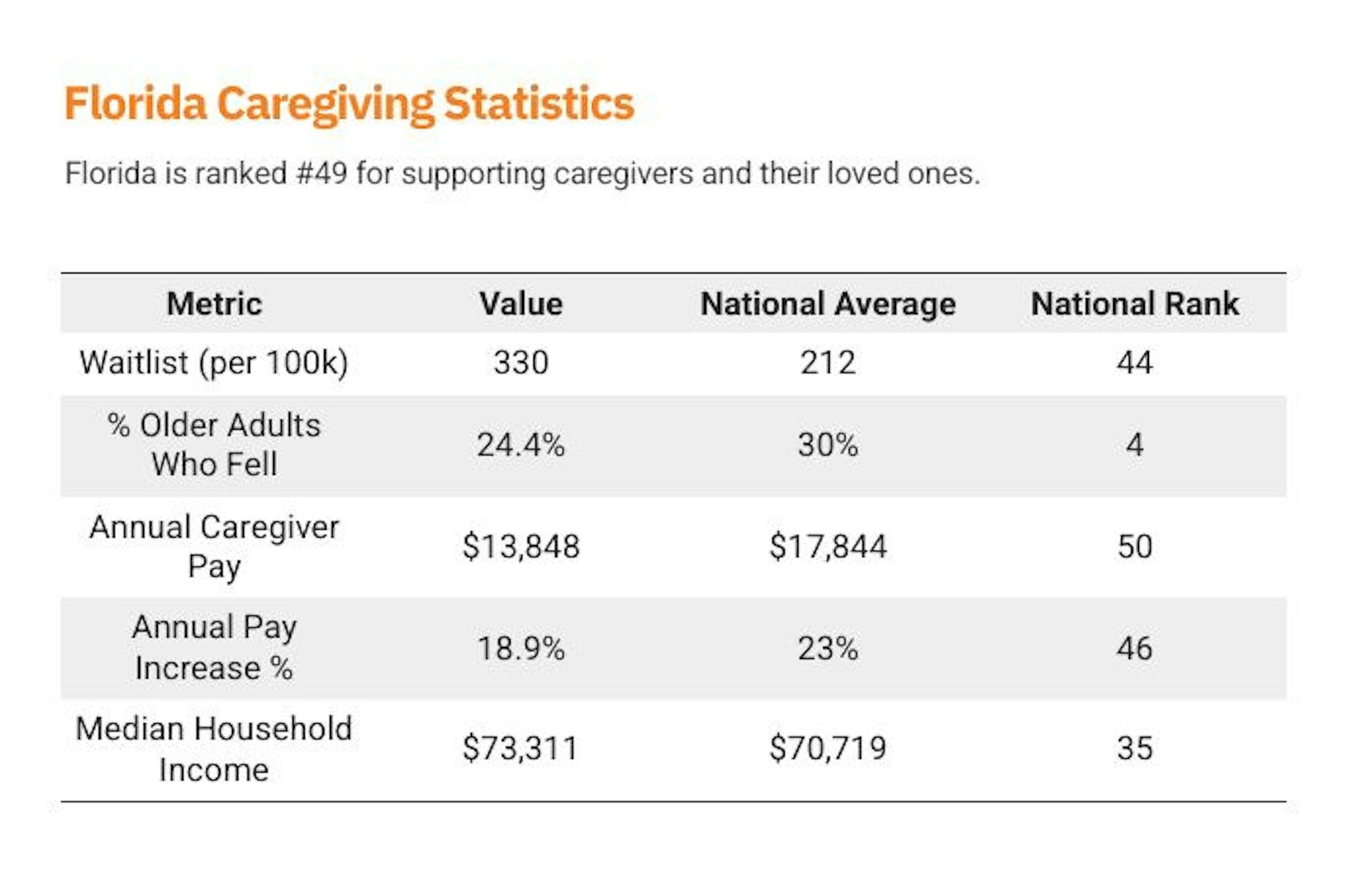 Florida is home to one of the largest senior populations in the country, yet its support for caregivers significantly lags behind. The state ranks last in caregiver pay, offering just $13,848 annually—far below the national average—while also placing in the bottom five for annual wage growth. This inadequate compensation, paired with a waitlist well above the national average, places enormous pressure on families trying to care for aging loved ones. While Florida performs well on fall prevention—with one of the lowest senior fall rates in the nation—the lack of robust financial and systemic support for caregivers threatens the sustainability of that success. With a median household income also below average, many families find themselves unable to bridge the gap with private services, making state-supported caregiving programs all the more essential.