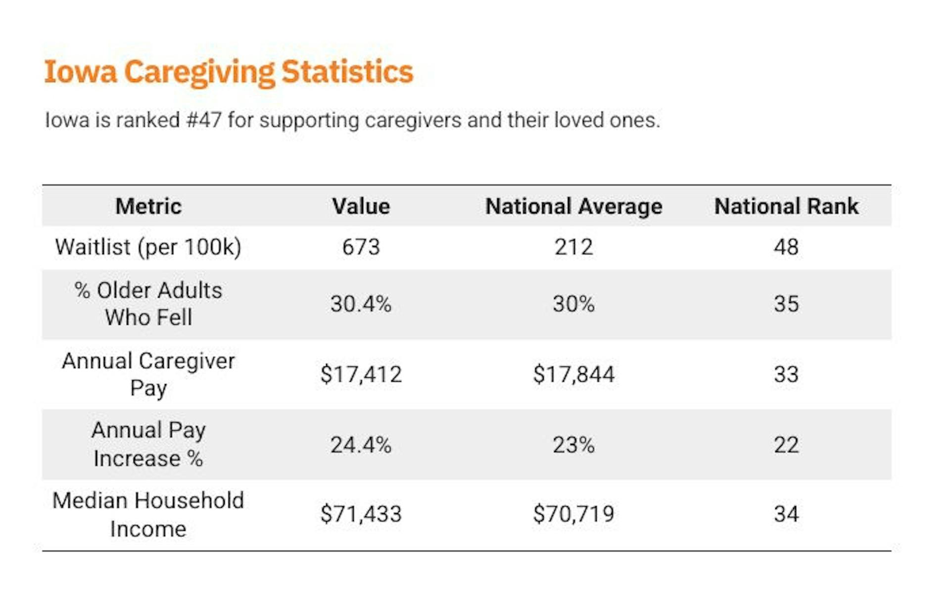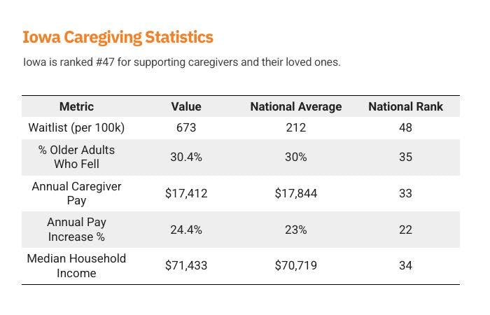 Iowa ranks among the lowest-performing states for caregiving access, with one of the longest HCBS waitlists in the country—673 people per 100,000 residents are waiting for services, more than triple the national average. This prolonged delay places an unsustainable burden on families, particularly in rural areas where alternative options are limited. While caregiver pay is slightly below average, Iowa’s wage growth is strong, suggesting modest improvements over time. However, that growth hasn’t yet closed the gap for caregivers struggling to make ends meet—especially in a state where the median household income is well below the national average. Compounding the issue, Iowa’s senior fall rate is slightly above average, pointing to potential gaps in preventive care and home safety support. Without targeted reforms, many Iowa families may continue to face both financial strain and avoidable health risks while waiting for help to arrive.