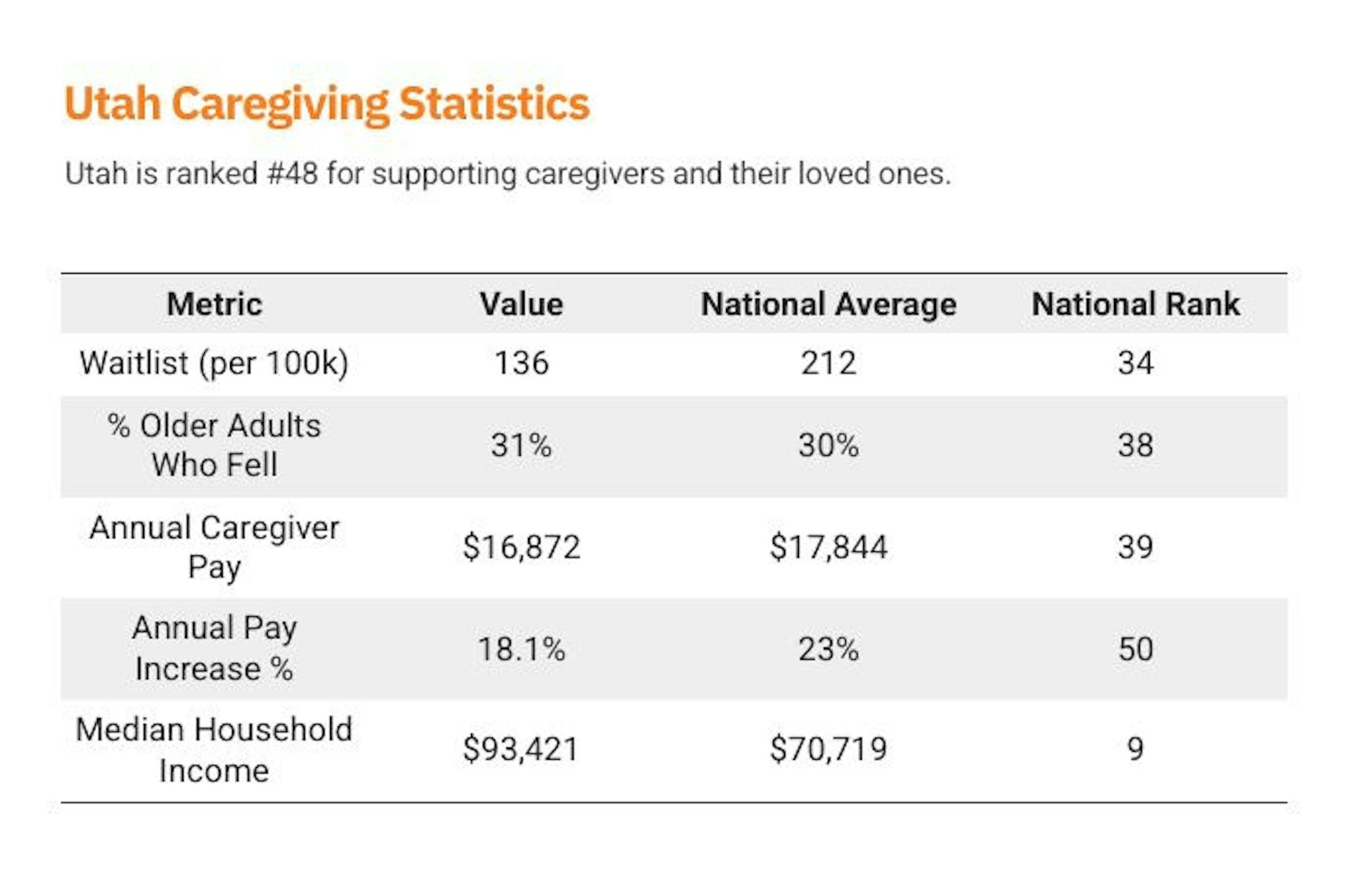 Utah presents a stark contrast between strong household earnings and weak caregiver support. Despite a median household income nearly $16,000 above the national average, caregiver pay is well below average at just $16,872 annually. That disparity makes Utah one of the worst states in terms of caregiver compensation relative to overall income, signaling a lack of prioritization for in-home care work. To make matters worse, Utah ranks last in the nation for annual caregiver wage growth, limiting long-term financial viability for those in the profession. The state's above-average fall rate among older adults also raises concerns about the adequacy of in-home care access and quality. While Utah’s HCBS waitlist is shorter than the national average, low compensation and wage stagnation suggest that families—especially those providing unpaid care—may be absorbing a disproportionate share of the burden.