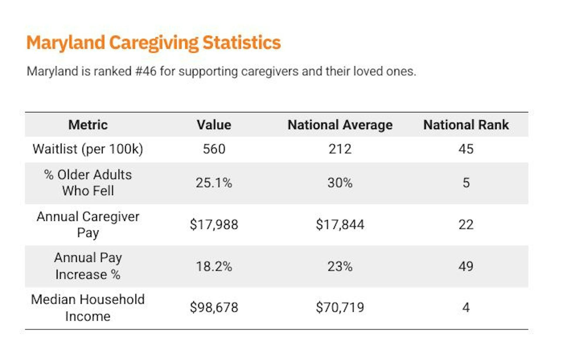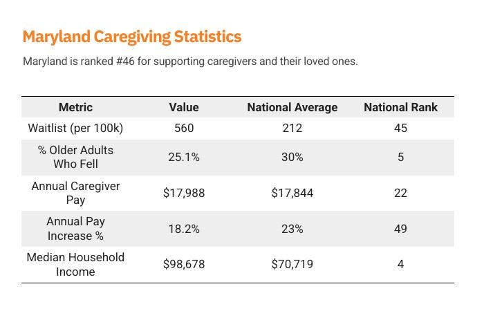 Maryland presents a mixed picture for caregivers and their loved ones. On one hand, the state boasts a high median household income—the fourth highest in the nation—and a senior fall rate well below the national average, suggesting relatively strong public health infrastructure. On the other hand, Maryland struggles with one of the longest HCBS waitlists, with 560 people per 100,000 residents awaiting services. This delay can significantly impact families who rely on timely access to home-based care, particularly those who cannot afford private alternatives. Caregiver pay is slightly above average, but wage growth is among the lowest in the country, making caregiving a financially stagnant career path despite the state’s overall affluence. For Maryland to fully support its aging population, it must pair its strong income base and health outcomes with faster access to services and better long-term compensation for caregivers.