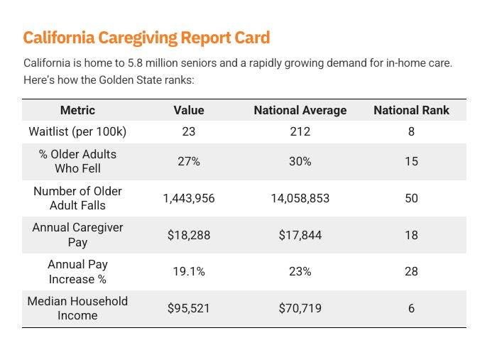 California has one of the shortest waitlists in the nation and pays caregivers competitively. Still, the relative financial benefit is modest due to the state’s high median income. With nearly 1.5 million older adults in California experiencing falls annually, expanding access to in-home care is not just a benefit—it’s a public health necessity.