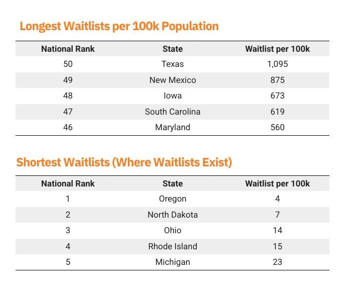 – Texas ranks last, with 1,095 people per 100K residents waiting for services—over 5x the national average. - Fewer Waitlists, Fewer Falls: