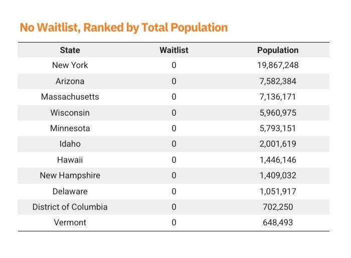 These no-waitlist states represent a mix of large and small populations, urban and rural settings, suggesting that strong performance is possible across a variety of conditions when political will and funding align