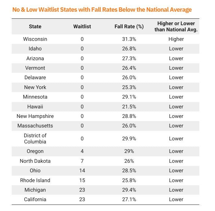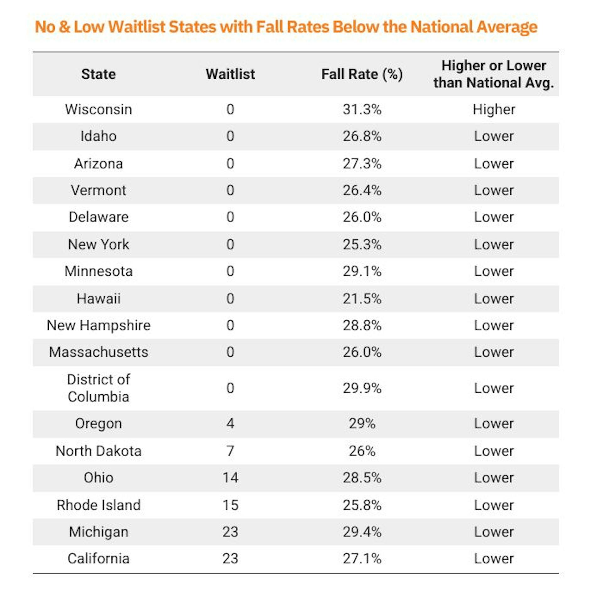 – States with no waitlists and lower-than-average fall rates include Hawaii (21.5%), Vermont (26.4%), and New York (25.3%).
