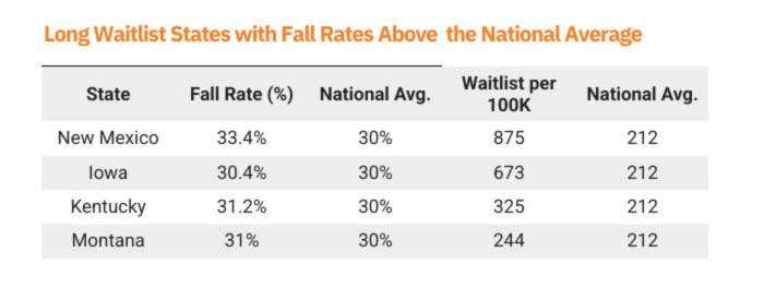 Long Waitlist States with Fall Rates Above the National Average