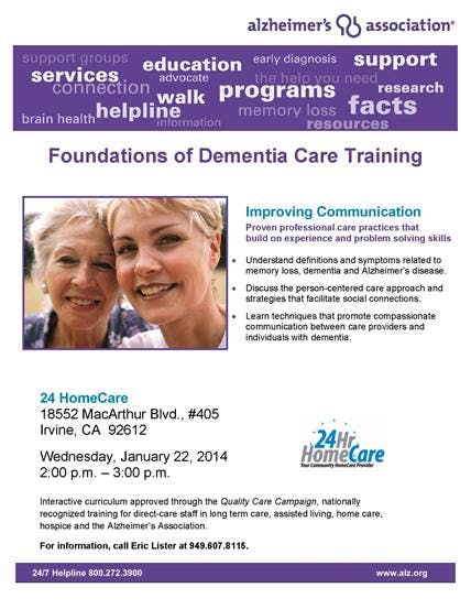 Beginning in January of 2014, 24 Hour Home Care’s Caregivers will be continuing their education on caring for patients who have been diagnosed with dementia. This series of three consecutive training sessions is provided by the Alzheimer’s Association, a trusted resource in Alzheimer’s and Dementia care, research, and education. The sessions will include an interactive curriculum that covers person-centered care approaches and techniques to facilitate the development of social connections and compassionate communication between Caregivers and those they care for. Please contact Eric Lisker at 949-607-8115 with any questions.